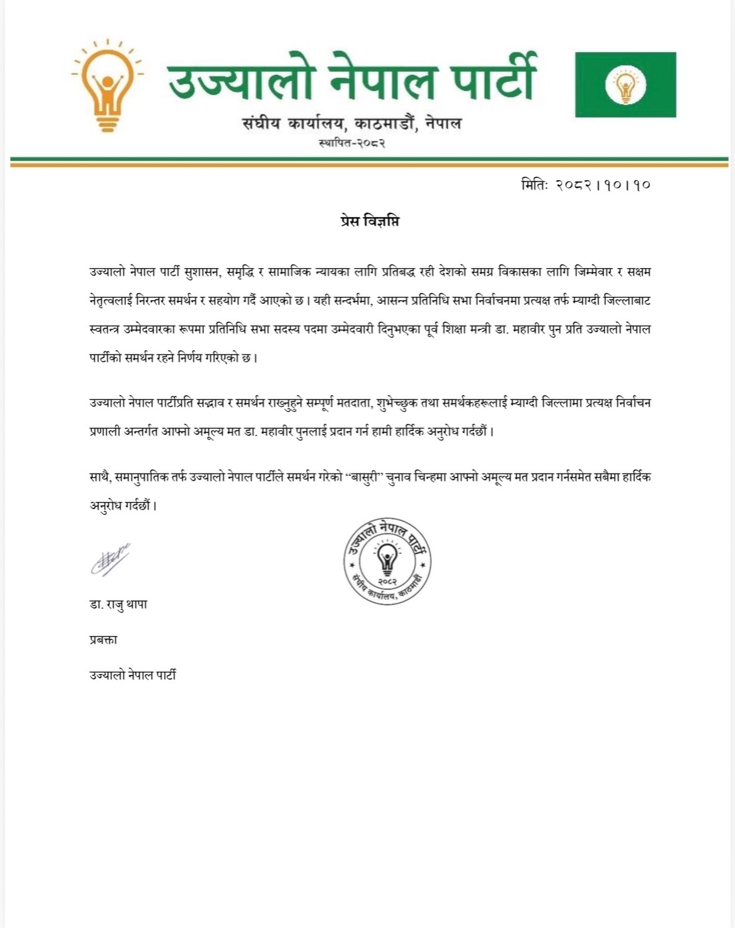 Ujyaalo Party Nepal has officially announced its support for outgoing Education Minister Mahavir Pun, who is contesting as an independent candidate in the upcoming House of Representatives election.